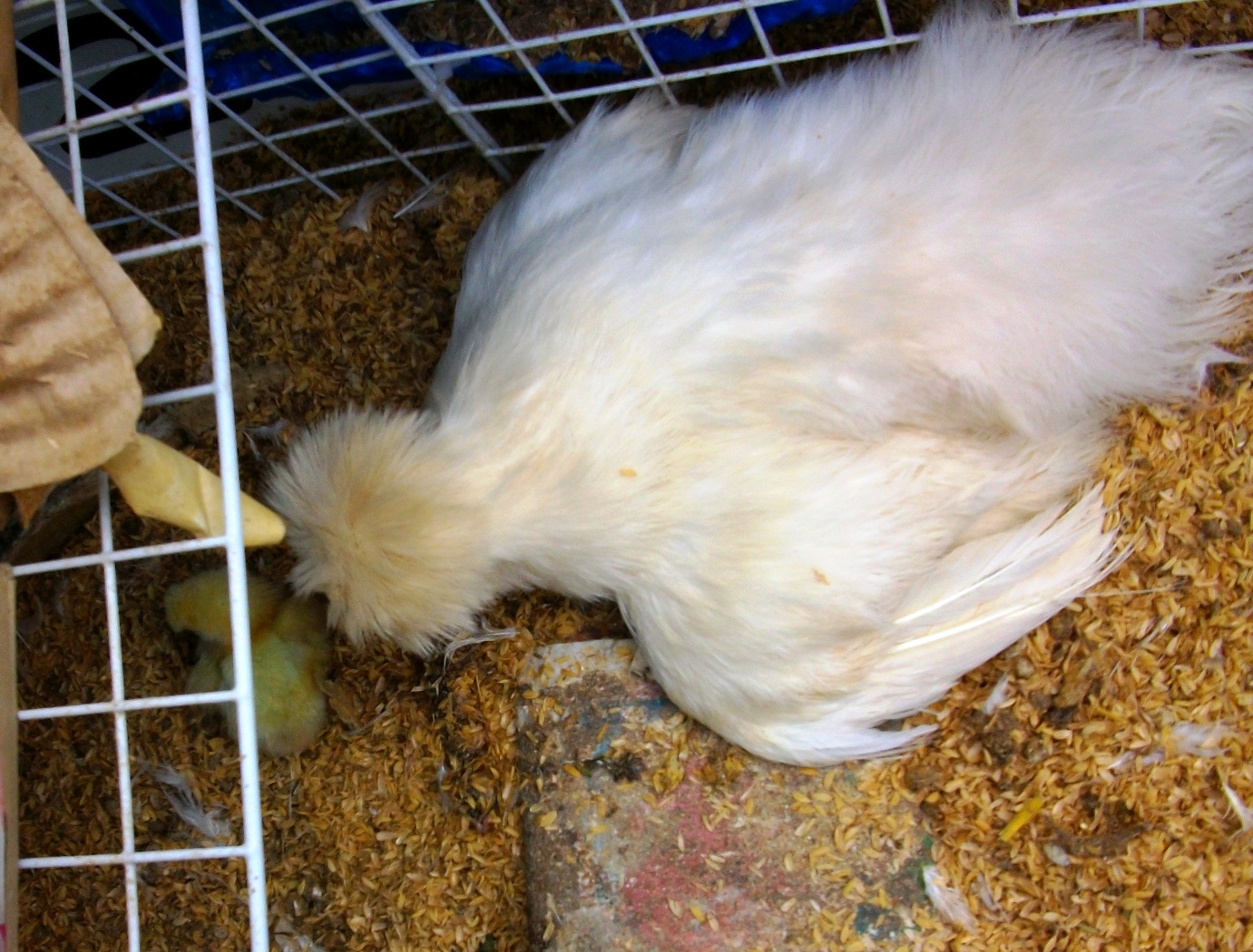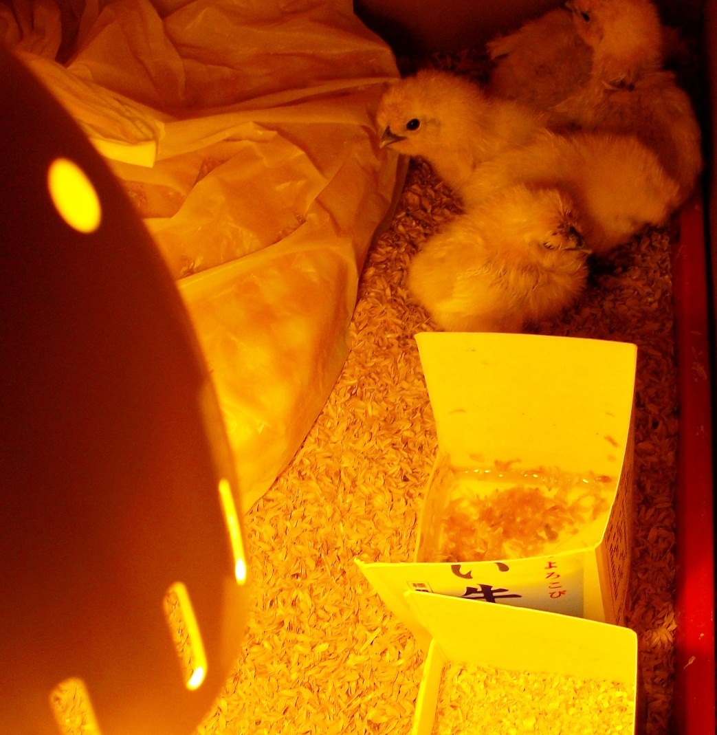 本日のハップ(烏骨鶏の名前)の様子です。段々、動き回るようになってきました。暖は、電球と電気こたつでとっております。餌箱と水入れは、牛乳パックで作っています。