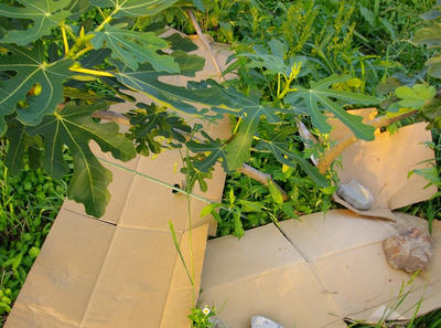 雨がよく降ったため、烏骨鶏さん達が食べるよりも早く、草が成長しています。草除けのため、いちじくの木の根元に、段ボールを敷きました。これを敷いておくと、遮光されて雑草が生えません。