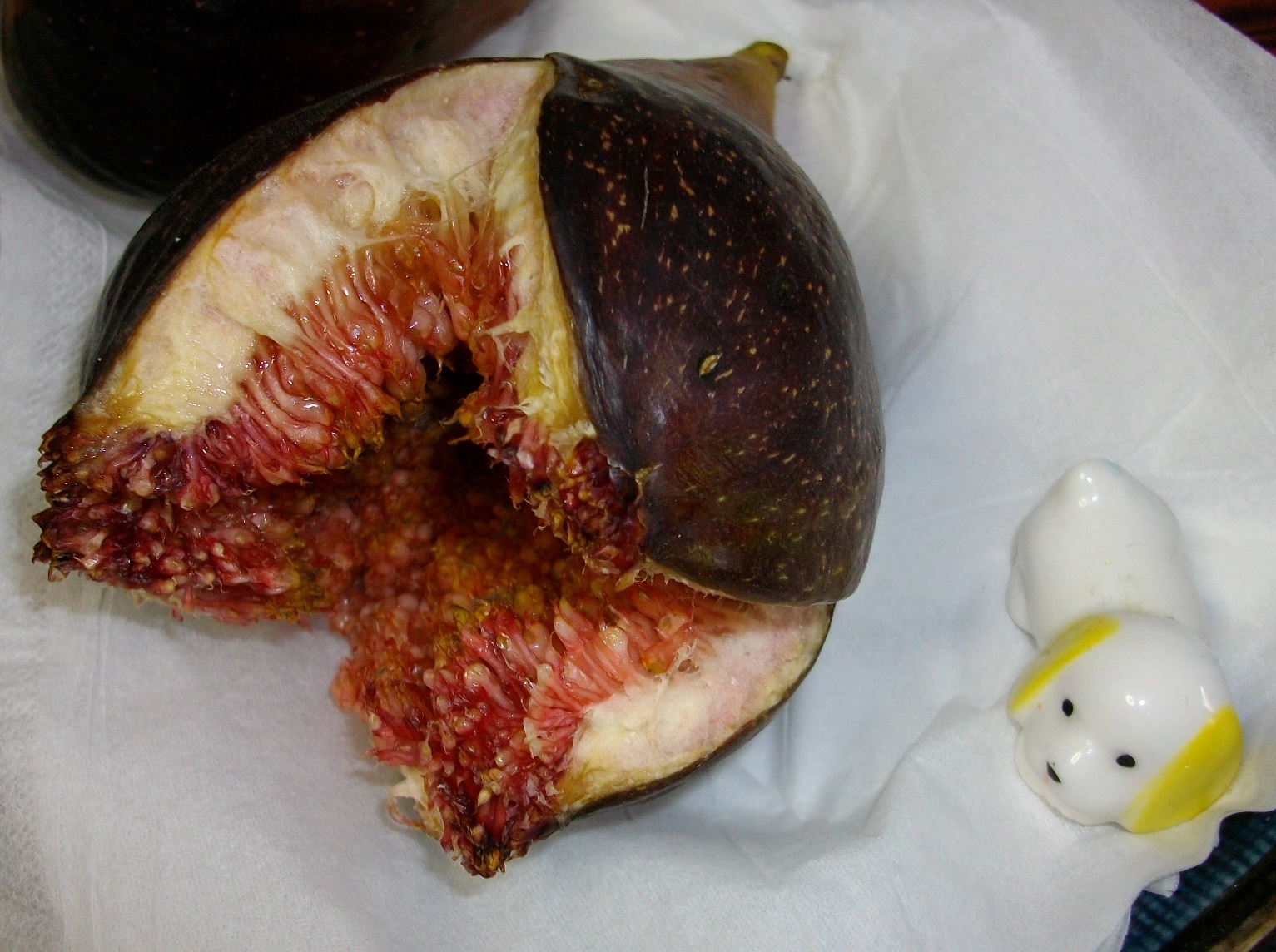 いちじくがどんどん巨大になっています。写真の犬の箸置きは、3㎝くらいのサイズです。片手では持ちにくいくらいの大きさです。今年のいちじくは、大きいし、美味しいぞ、こりゃ。