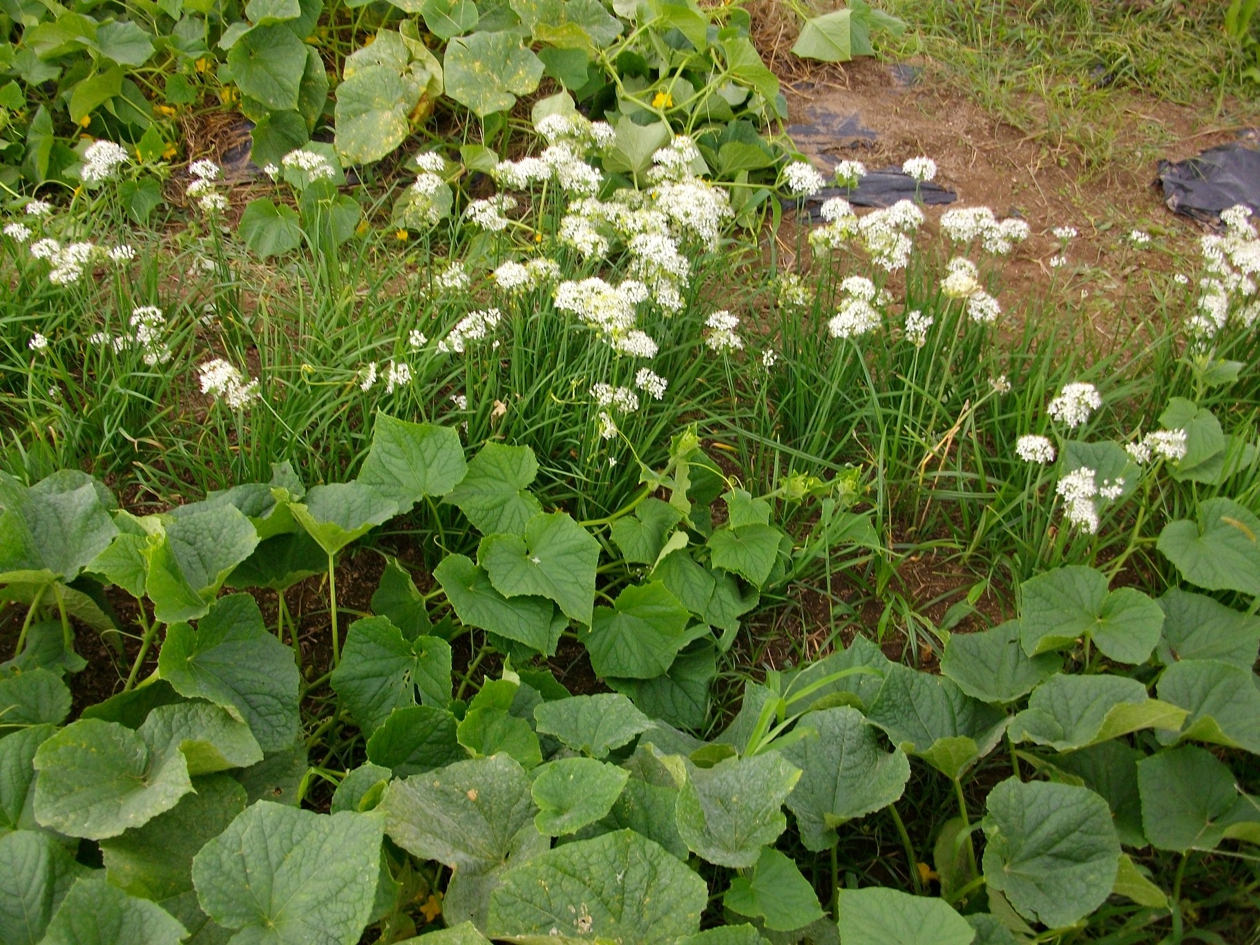 地這いの胡瓜が育ちすぎて、ニラを侵食してしまっています。(><;)